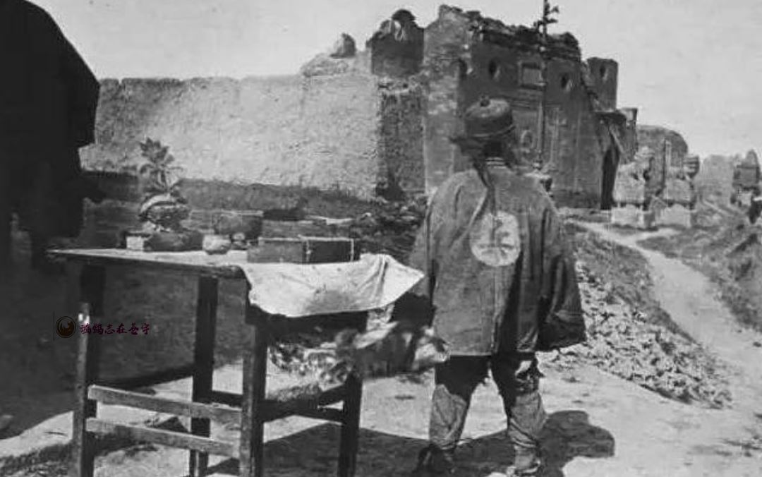 一个背对着镜头的清兵,穿着邋遢,戴着毡帽,头发散乱,要不是身上的衣服写着一个“兵”字,还以为是一个乞丐。当兵的竟然穿成这样,战斗力可想而知。