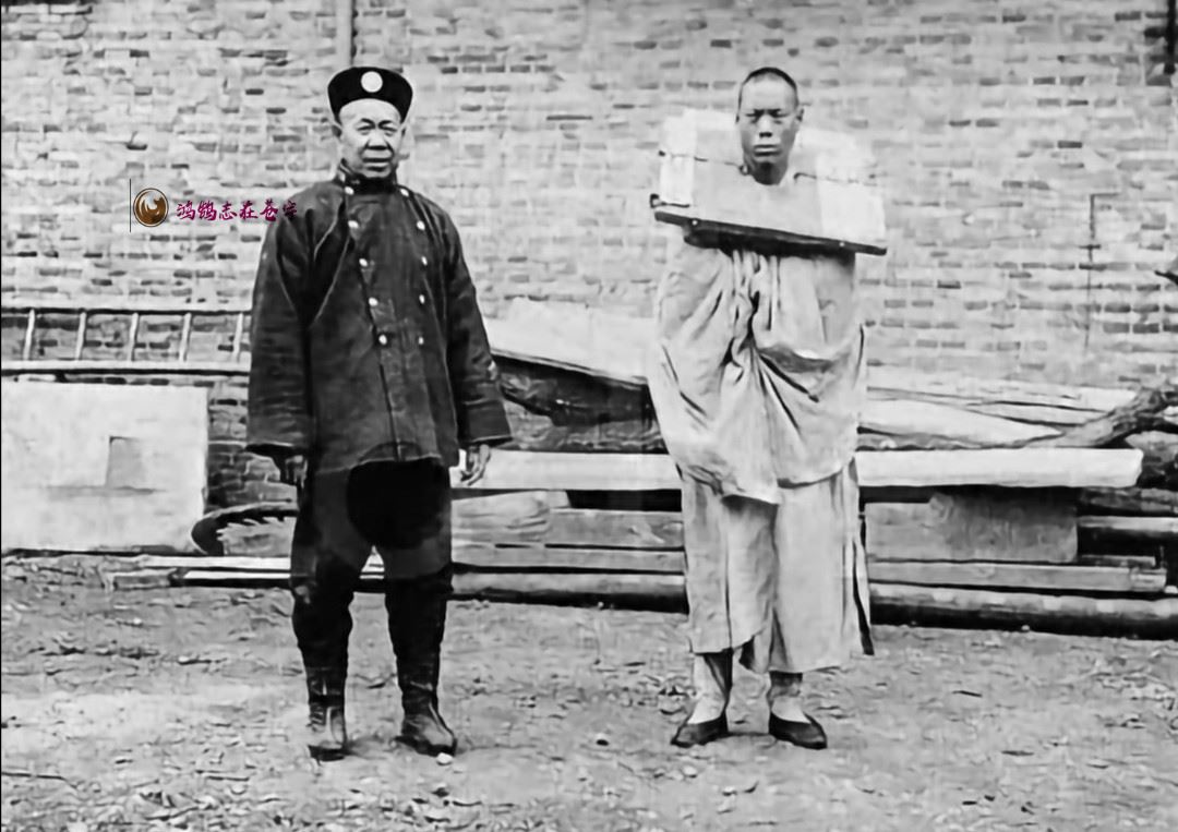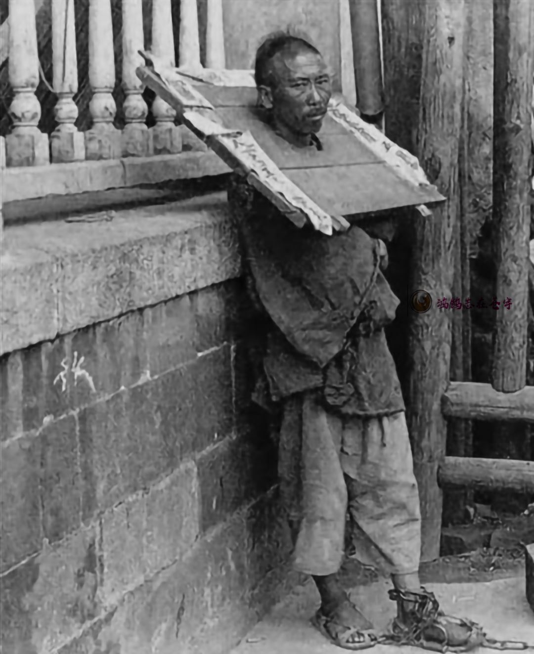 戴着木枷的犯人,脚上更是戴着脚镣,虽然被判刑,可满眼里都是不屑的眼神。