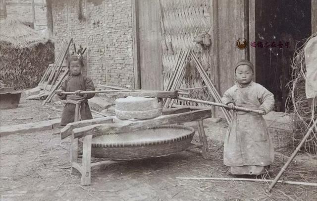 两个孩子在推磨,小小年纪就开始干活,童年的记忆怎不是灰色的?