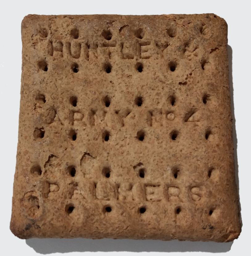 这块至今保存完好的饼干证明了自己绝对是干粮界的硬核玩家,它上头印着自己的名称——HUNTLEY&PALMERS ARMY No.4,意为亨特利&帕尔莫斯 陆军四号。这是H&P公司于1914年,也就是一战刚开打时期应政府要求制造的一种10.5cm X 10.5cm X 1.5cm的饼干。