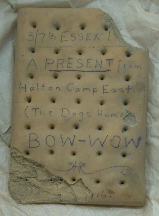 当然,也有在饼干上写字的,大意是这玩意来自东霍尔顿营地(一个皇家空军训练基地)的狗窝,还用象声词Bow-Wow描述狗叫,猜测是用来吐槽这饼干只有狗咬的动。