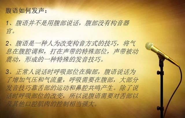 还有很多进阶的技术,比如攻克爆破音,这个嘴唇在不动以后很难用腹语发音,所以突破这些难关对腹语技术的提升非常重要!以上这些是否正确,还请腹语术高手留言指正,有兴趣的朋友也可以留言探讨!
