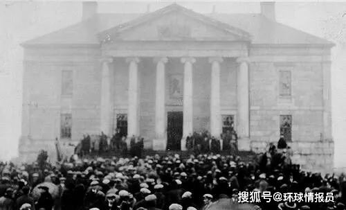 ▲1932年,人们在纽芬兰殖民大厦前,对当地恶化的经济情况进行抗议,一年后纽芬兰自治政府下台,英国政府重获直接统治权