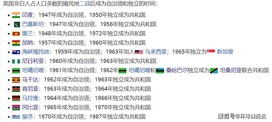 ▲二战后,越来越多非白人占多数的英国殖民地获得自治领的地位,并最终独立