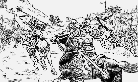 言讫,挥大斧直取关公。公大怒,亦挥刀迎之。战八十余合,公虽武艺绝伦,终是右臂少力。关平恐公有失,火急鸣金,公拨马回寨。《第七十六回》
