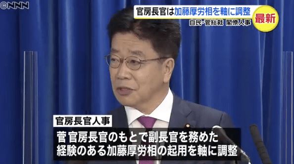 在菅义伟即将走马上任新首相后,现有官房长官的位置最先空缺,目前的动向是将厚劳大臣加藤胜信任命为新任日本官房长官。