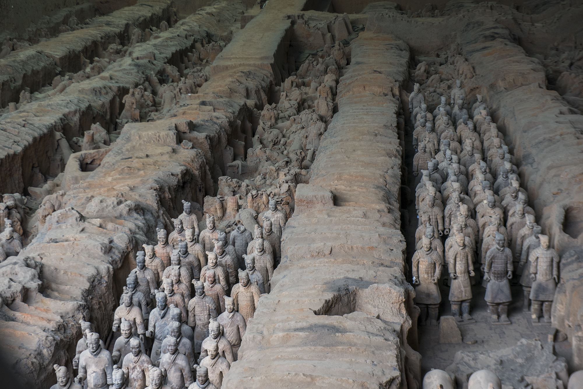 1号坑的兵马俑数量最多,虽然看似完整,实际上都是经过考古专家一块块拼接完成的。发现的时候基本都已经碎掉了。关于兵马俑碎掉的原因,主要有两种说法。一说是秦朝工匠为了陈列兵马俑,贴心的打了木梁支撑,但因为年代久远,土层下陷,木梁逐渐腐烂,倒塌的时候压碎了兵马俑。