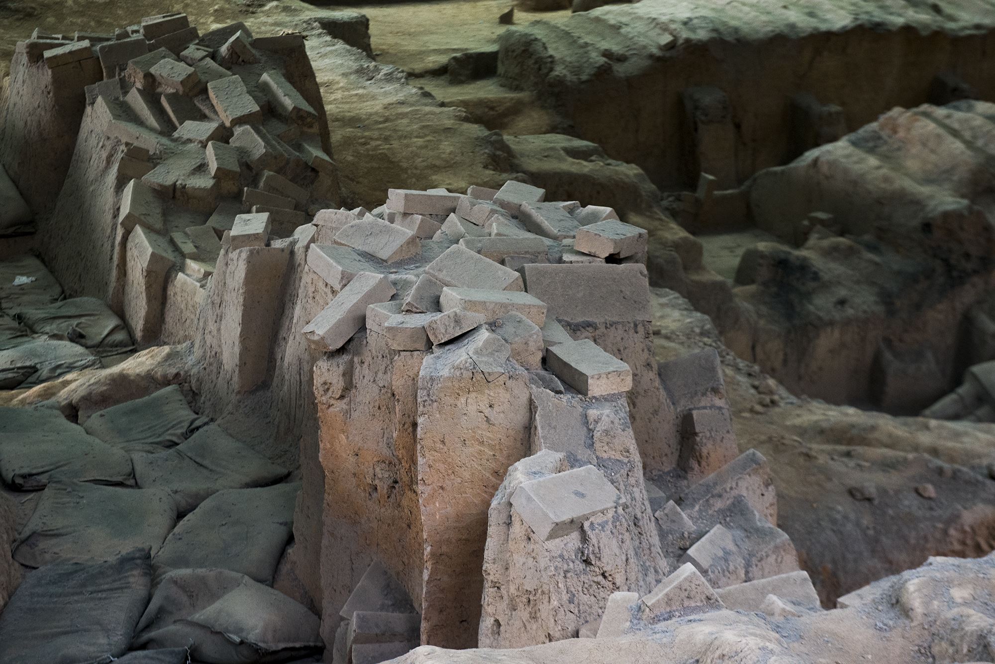 兵马俑的土坑上面能看到一个个的坑窝,像放置过什么物品,其实,这些坑窝里之前放置的是一具具的棺材。也真是巧了,棺材的重心恰好都是在土墙上面。
