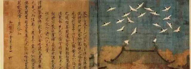 《瑞鹤图》是公认的宋徽宗存世工笔写实类花鸟画真迹,为存世绝少的宋徽宗“御笔画”。此图画庄严耸立的汴梁宣德门,门上方彩云缭绕,18只神态各异的丹顶鹤,在上空翱翔盘旋,另两只站立在殿脊的鸱吻之上,回首相望,天空及宫殿周围的祥云皆以平涂渲染,更烘托出仙鹤动飞之势和曼妙体态,气氛祥和吉庆。画后有赵佶瘦金书叙述一段。《瑞鹤图》曾收入《宣和睿览集》,金军攻入汴梁时,这件作品被拆成单幅的卷轴流散出去,清乾隆晚期被收进清宫,溥仪私自夹带出宫后流失到东北,最终成为辽宁博物馆的藏品。