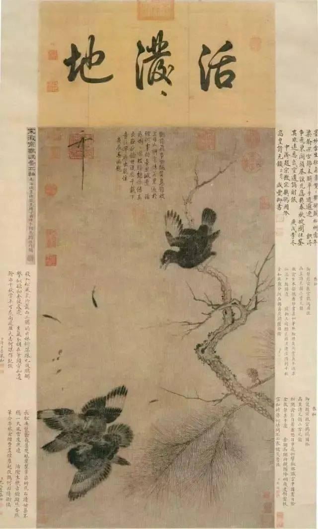 此作为赵佶画风的名作,可以领略到北宋皇家风格与画院的截然不同的水墨写意。画幅有乾隆御题诗一首,诗堂有乾隆御题“活泼地”。乾隆年间收入清宫,后经嘉庆、咸丰内府收藏,并有咸丰帝和乾隆韵一首。由于原作破损严重,庞氏邀请海派名家陆恢精心对摹两幅,传将原作毁去,现一本于1936年原田尾山(谨次郎)购得携往日本,一本于20世纪50年代由庞家后人捐给国家,收藏于南京博物院。《鹆图》上方有徽宗署“天下一人”押,以押书署款。宋初已有帝王画押,但把押书移到画款上来却还未之闻。以之作为一种题款格式,是书画题款史上的一个饶有兴味的现象,并钤“御书”方印.如此简洁、飘逸的草押之上,却钤一方如此规矩方圆、叠满排密的御玺,其间在格调上的处理,似乎也包含着某种匠心,但不知可是徽宗皇帝的本意呢?