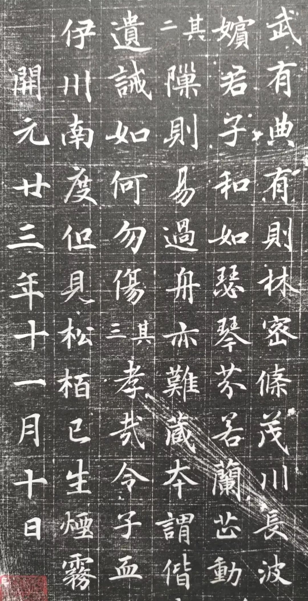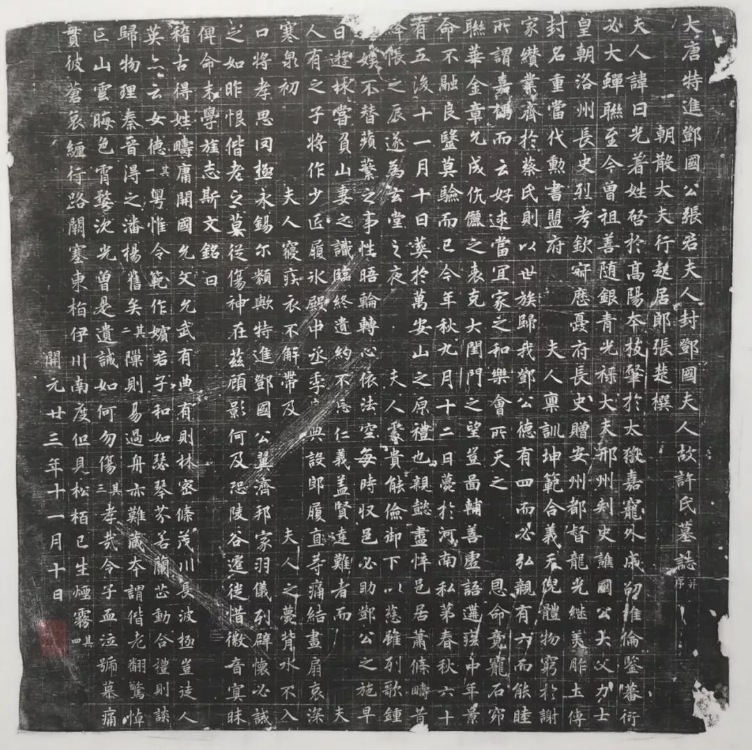 这件墓志,叫做《 张暐妻许日光墓志 》,最新出土于洛阳。该志书法可见盛唐时期书者对《兰亭序》的取法传习。强烈受到《兰亭序》影响明显,诸多单字与神龙本《兰亭序》如出一辙,字形准确,笔法灵动,飘逸有神。是对《兰亭序》存世的强力佐证。
