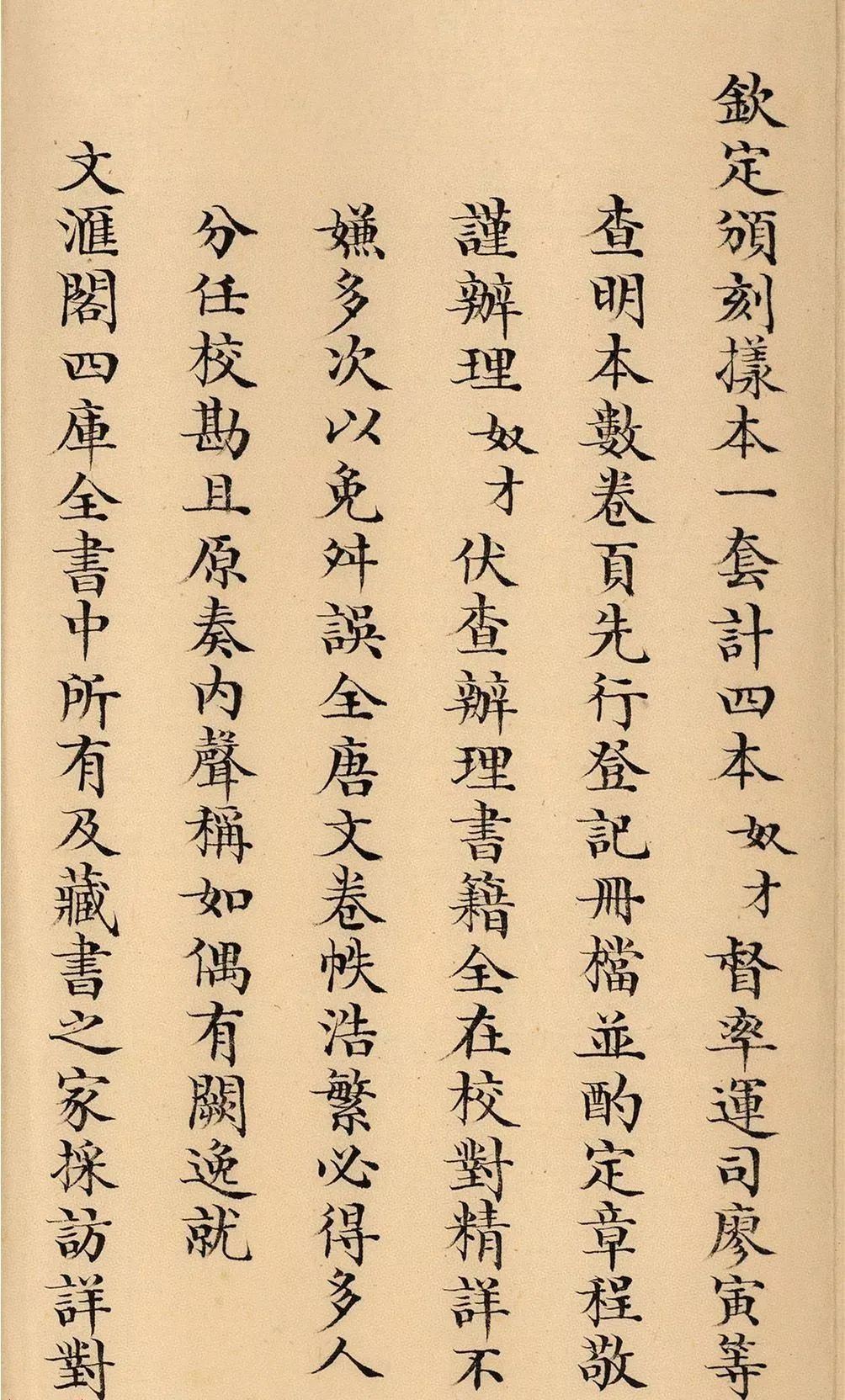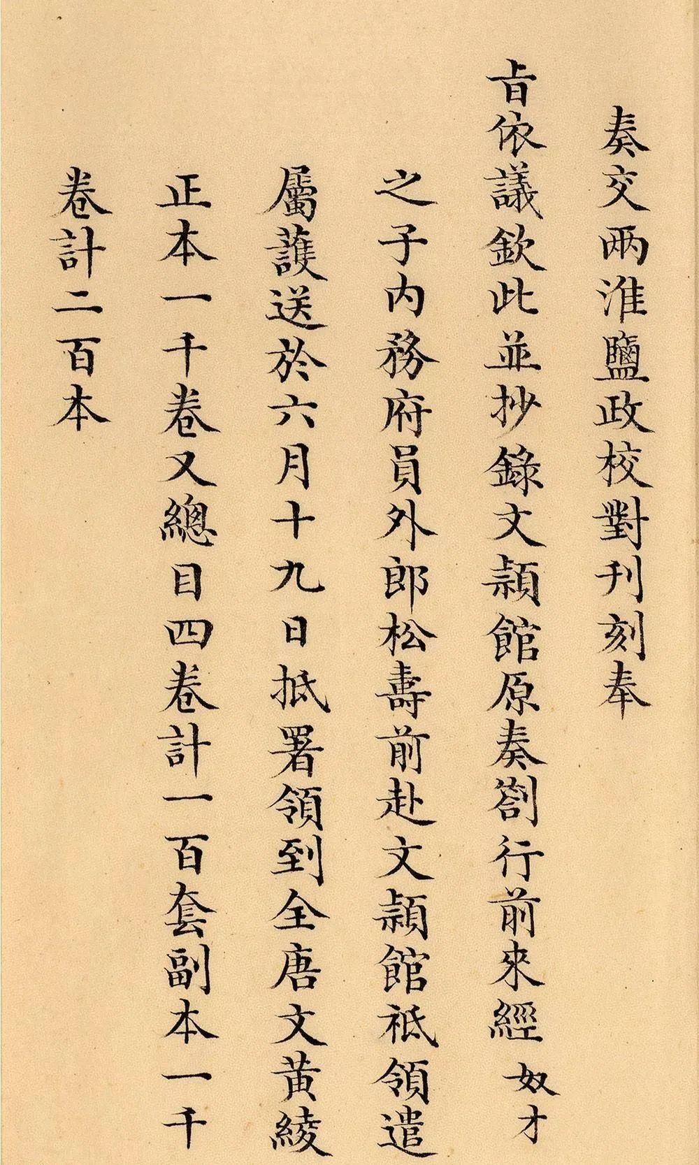 嘉庆十九年(1814)六月二十九日,《全唐文》编纂完竣后,嘉庆皇帝命人将书送交两淮盐政阿克当阿(1755-1822)主持刊印工作。阿克当阿,字厚菴,满洲正白旗人,其致力推动地方文化事业,并编纂《重修扬州府志》。阿克当阿接奉朝廷命令,随即延聘江南着名文人与优秀刻工进行校刊雕板工作,二年余时间即完成此一煌煌巨籍。奏摺为阿克当阿奏报接奉交办事情的处理经过。