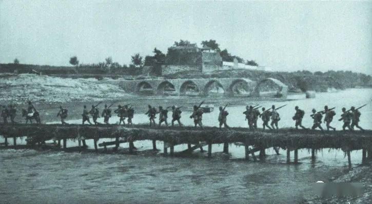 (10月10日,河北正定,日军工兵在滹沱河上架桥完成,桥上通过的日寇主力部队)