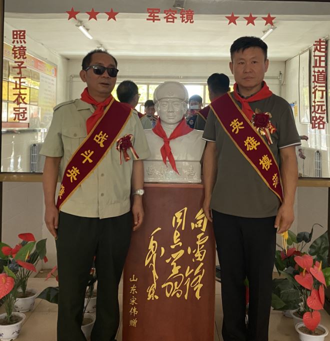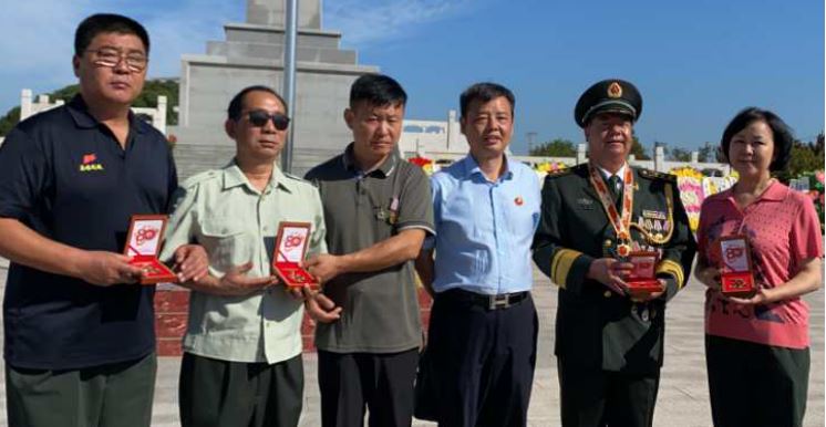2020年9月5日,史光柱(左2)、张兴武(左3)、毛羽亮(右2)、钟惠玲(右1)等英模和参战老兵在河北平山县河渠希望小学建校10周年庆典暨英雄群雕落成仪式上合影(图片由张兴武提供)