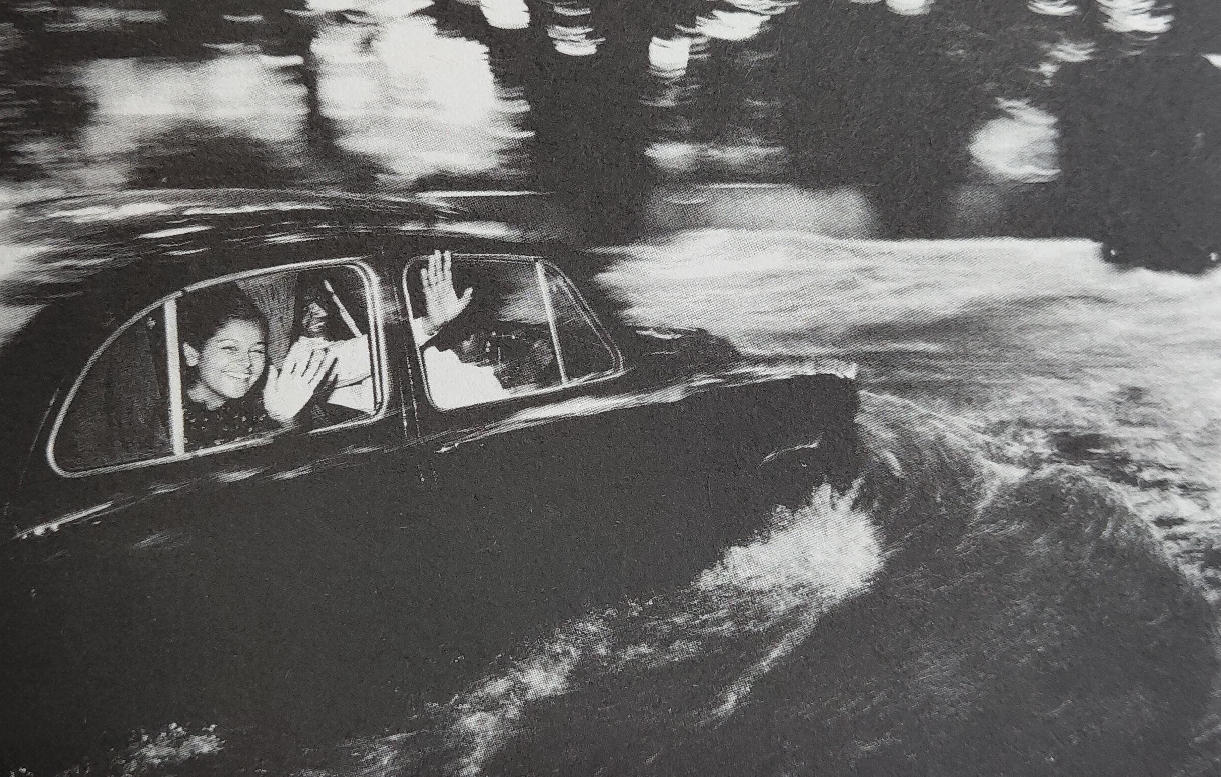 照片中,我们可以看到车内有两个人,正在透过车窗对外招手,他们的脸上挂着灿烂的笑容。