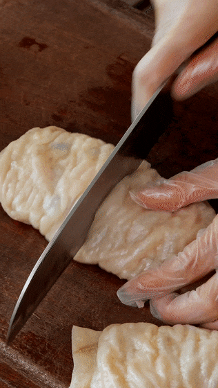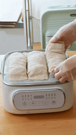 抓住一边就这样一直卷卷卷起来,两边收口捏紧,再向着中间挤一挤,就能上锅蒸了。