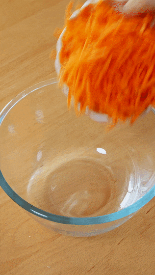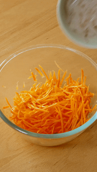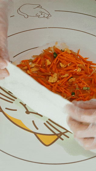 提前准备好的胡萝卜丝,你稍微给它喷点油,然后搅拌开,这样我们后续放盐的时候,它就不会腌出水了。