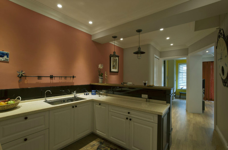 在开放式厨房中,不少人喜欢在厨房和客厅相通的部分做吧台,平时作为餐桌使用,朋友来了,调几杯鸡尾酒,颇有些异国情调。既满足了年轻人的心理,又巧妙利用了空间。