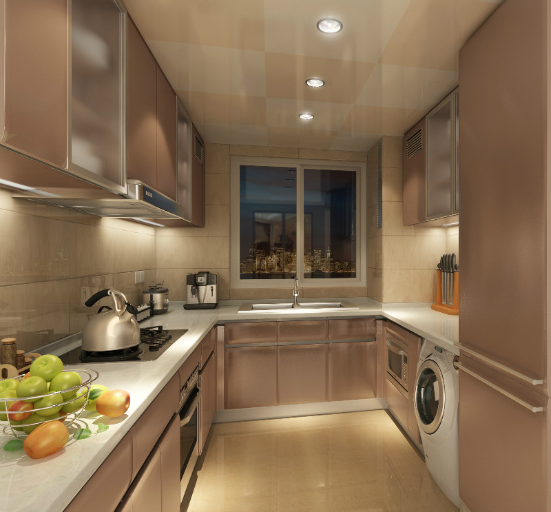 厨房最好要以方正为好,长方或正方的为好,不过假如你的厨房因为种种原因是多变形的话,可以在合适的地方打上柜子从而使房间能变得中规中距的。