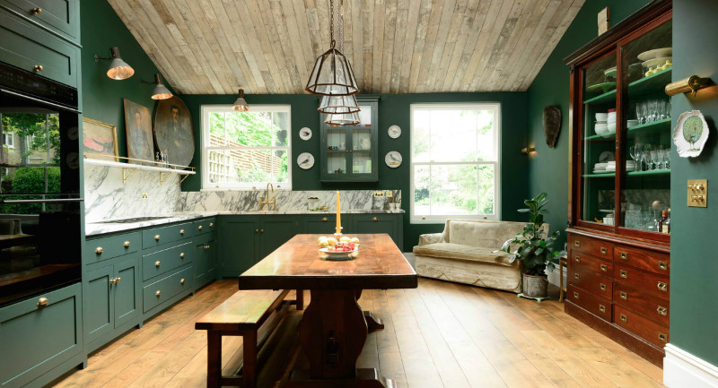 返璞归真的田园色彩。置身实木的纯朴,点缀田园的花草,加之简洁的造型设计,使乡村氛围盈满家庭空间。老年夫妻及性格稳重的人可以此为橱柜颜色首选。木的单纯辅之以淡蓝与墨绿,更能突出温馨感受。