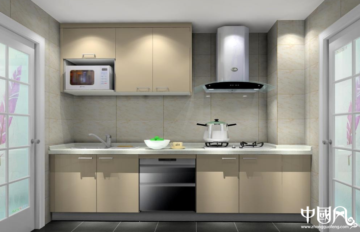 单列厨房的平面布局即只是厨房空间的一侧墙壁上布置家具设备,一般情况下水池置于中间,冰箱和炉灶分布在两侧。这种类型厨房工作流程完全在一条直线上进行,就难免使得三点之间的工作互相干扰,尤其是多人同时进行操作时。因此三点间的科学站位,就成为厨房工作顺利进行的保证。单列厨房在布置时,冰箱和炉灶之间的距离应控制在2.4米和3.6米。若距离小于2.4米,橱柜的储藏空间和操作台会很狭窄;距离过长,则会增加厨房工作往返的路程,使人疲劳从而降低工作次效率。