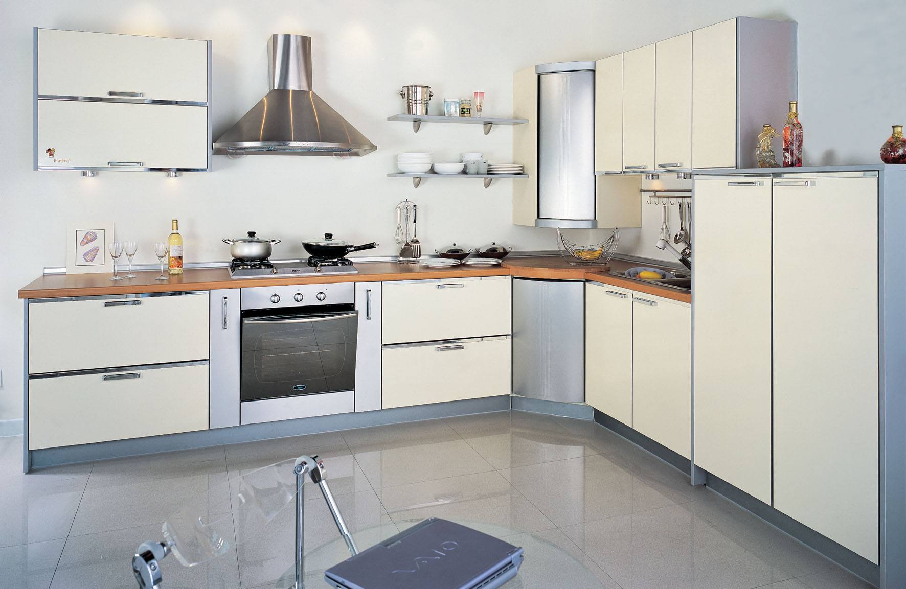 厨房宜采用欧式橱柜 ,欧式橱柜能整齐地收纳厨房杂物,使厨房容易保持清洁,橱柜以浅色或冷色系为佳,在烹饪时使人容易保持轻松愉快的心情。
