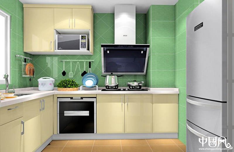 轻松舒爽、赏心悦目的色彩。绿色是永远用不完,永远不会让人感到厌烦的主题,因为它的每一点变化,都对应着自然给人类的印象,所以绿色适合所有喜欢它的人。从淡绿转化为灰绿,然后暗紫,完成室外到室内的过渡,对应了人的视觉对空间的自然反应。淡绿如田野的地板,黄色如秋叶的柜体,墨绿如松针的台面,构成一幅自然景色,使人心情豁然开朗。淡绿与淡蓝的配合,则使厨房充满盎然生机。生活在淡绿的空间里,梦都是清新的。明快而错落的绿,让人仿佛来到青山翠谷。