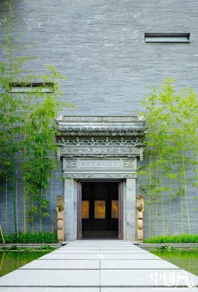 南方有一宽敞绿茵、平地、水池、停车场,即是有明堂。这样分聚于前就用中门接收,门便适宜开在前方中间。