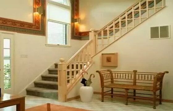 楼梯的材料最好是用接气与送气较缓的木制的梯级,少用石材与金属制成的梯级。木材是最天然的材料,而金属等材料或多或少都会带来一些比较尖锐的气场,对居住者的健康会带来不利。
