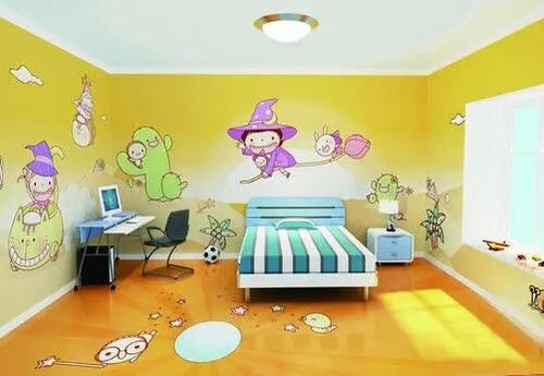 儿童卧室内部装修会无时不刻不影响这孩子并且这种影响是潜移默化的,首先色泽要淡雅,不可用太刺眼的大红大紫色,避免刺激小孩,也忌用黑色及纯白色,而用淡蓝色为底点缀一些草绿、明黄、粉红的色泽则较好,能取得和谐的效果。