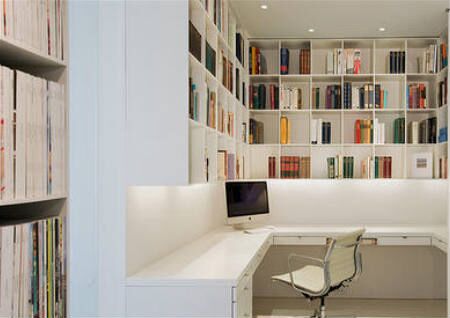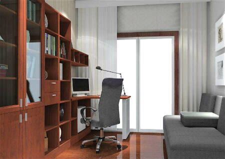 书房中通常都会摆放书柜、书架等,需要注意的是,书架或在书柜的高度不宜太高,否则在空间上容易给人一种压迫感。