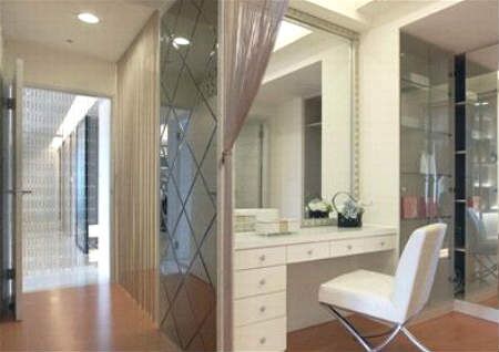 如果镜子正对门,但是却由于格局问题无法移动,那么我们可以在镜子上面做些文章,磨砂,加艺术字,加山水画,在镜子前加上饰品等等。