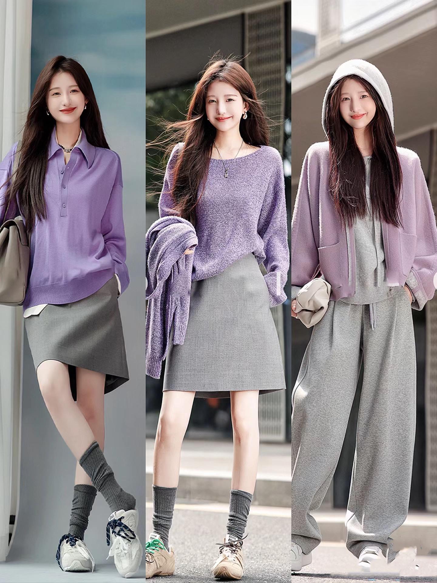 小女生的温柔,小心思的细腻,在这种浅柔色系上、可以更直观的表达。浅紫色的针织衫,软糯舒适,配上灰色半身裙、阔腿裤,也是温润大方。