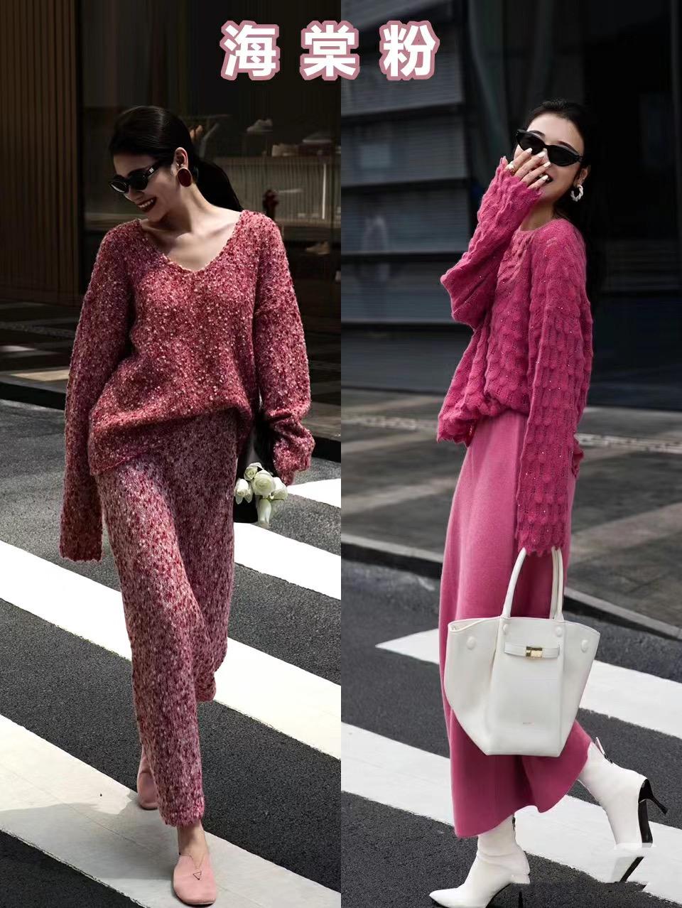 海棠粉就非常柔和,不那么明亮,对肤色挑剔性不高。海棠粉的针织衫,配同色系的阔腿裤,简洁又高级,一看就很舒适从容。