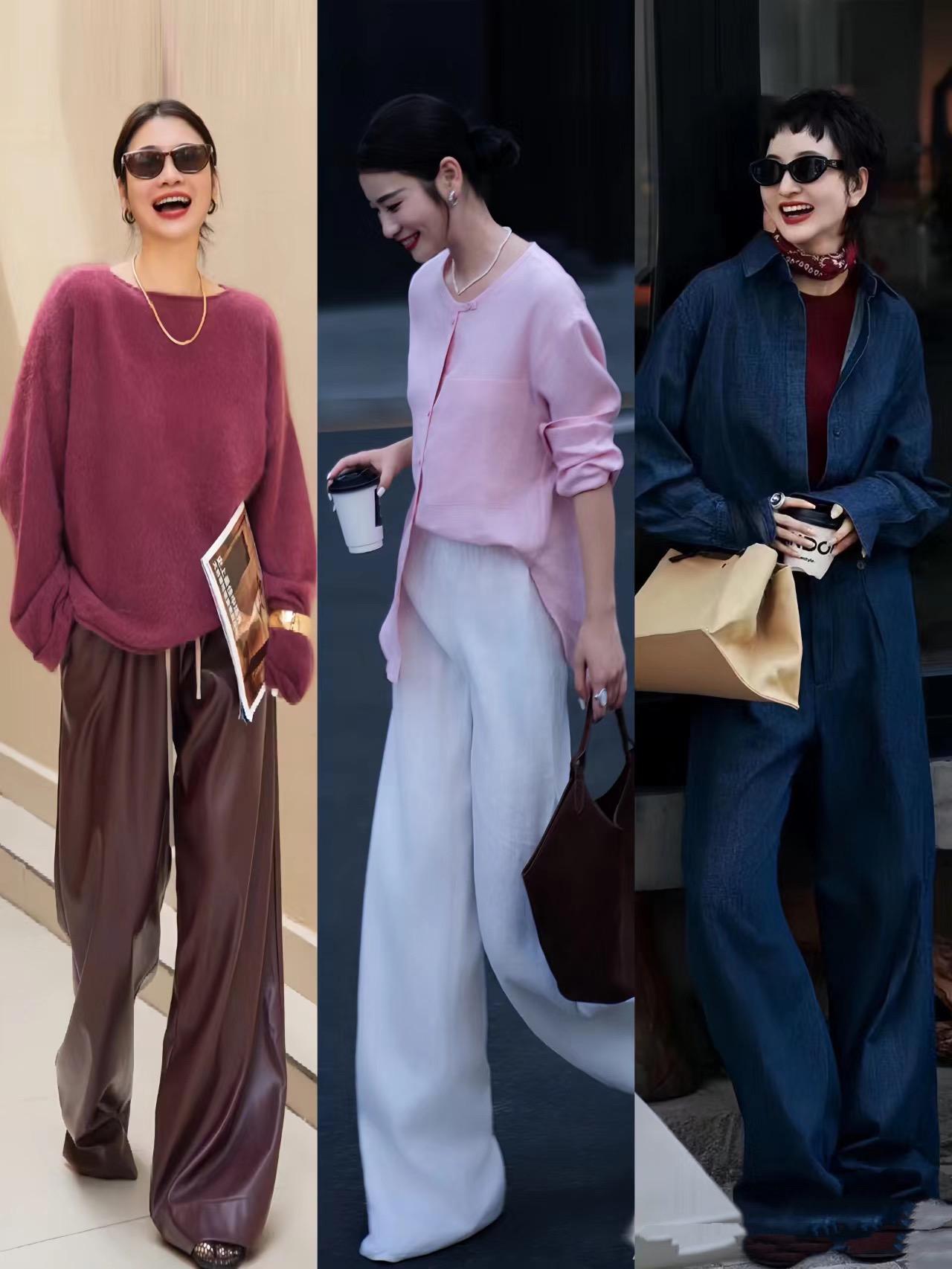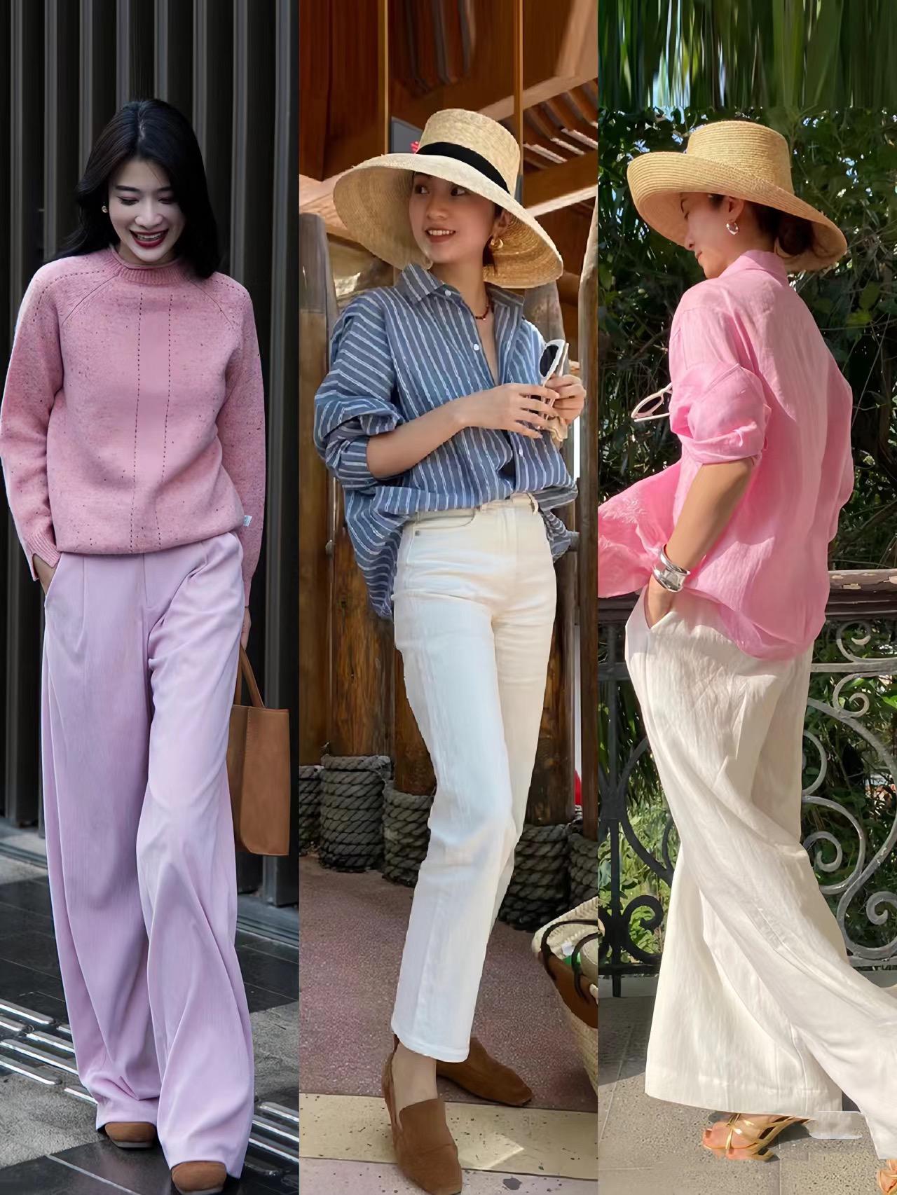 海棠粉的针织衫,配上白色阔腿裤,是那么的简单干净。尤其是自然塞衣角的方式,打造出高腰线、很利落显高。