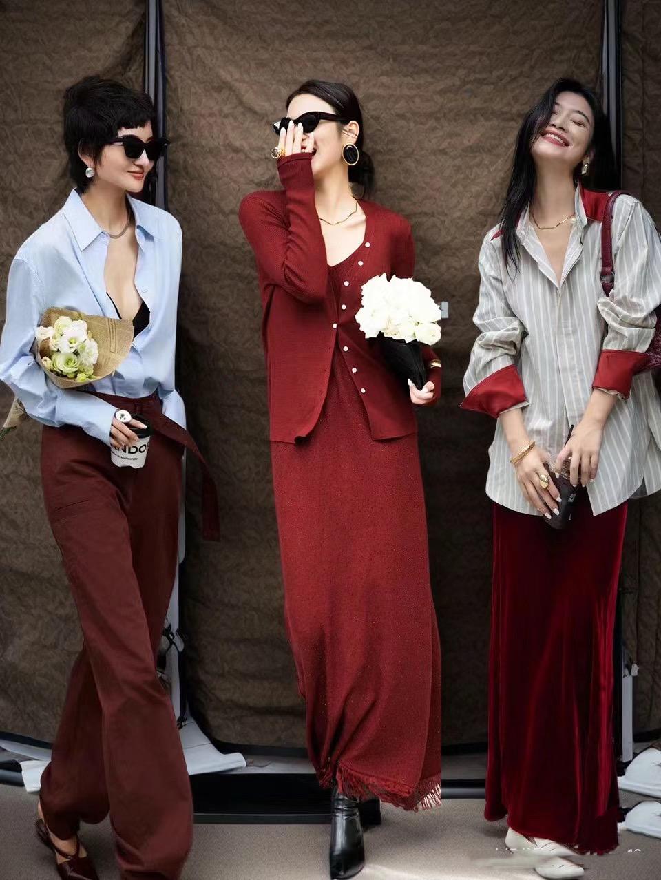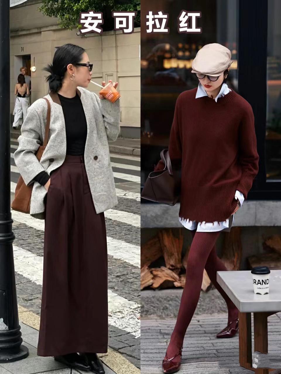 安可拉红的针织套裙,那么妖娆又惹眼。想大气一点,就穿安可拉红的阔腿裤吧,配浅蓝色衬衫又飒又美。