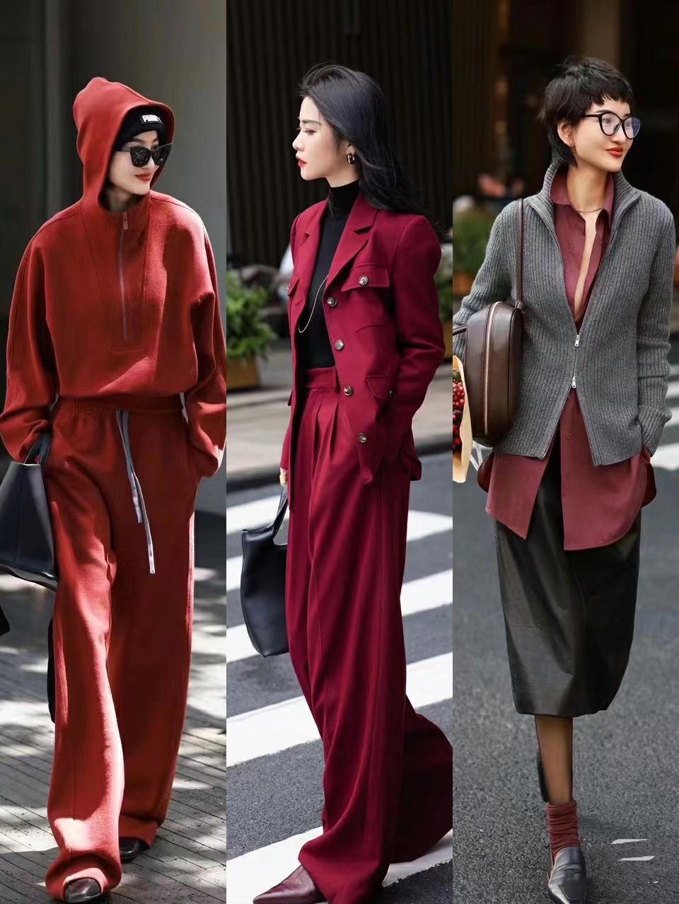 秋天里的安可拉红,也是很有氛围感和意境美的颜色。这种带有一定亮度、饱和度有很高的颜色,显白不乏味,怎么穿都洋气。