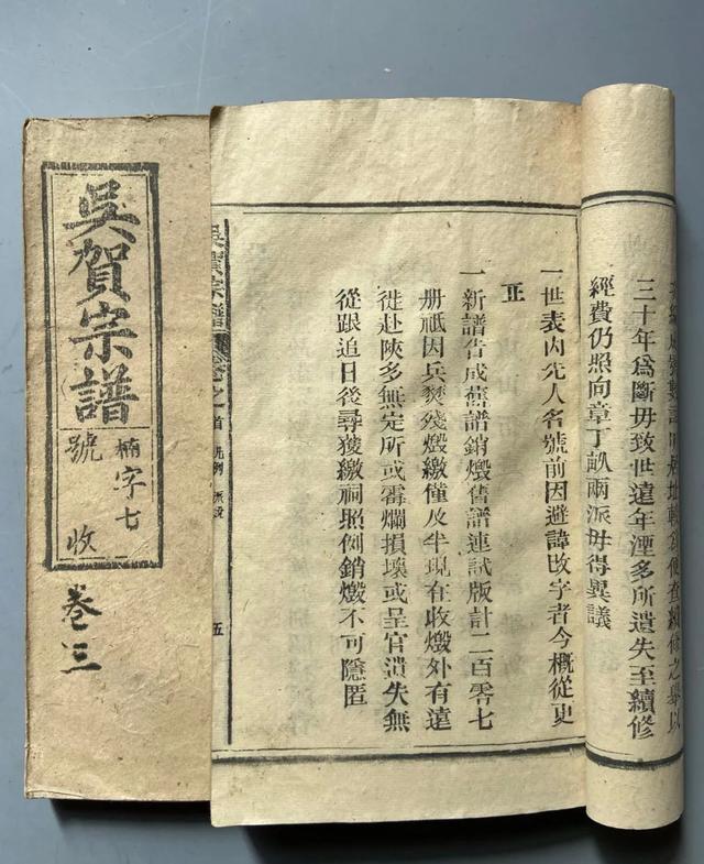 民国三十五年(1946)木活字本《(安徽宿松)吴贺宗谱·凡例》:“新谱告成,旧谱销毁。旧谱连试版计二百零七册,只因兵燹残毁,缴仅及半。现在收毁外,有远徙赴陕,多无定所,或霉烂损坏,或呈官遗失,无所跟踪,日后寻获缴祠,照例销毁,不可隐匿。”