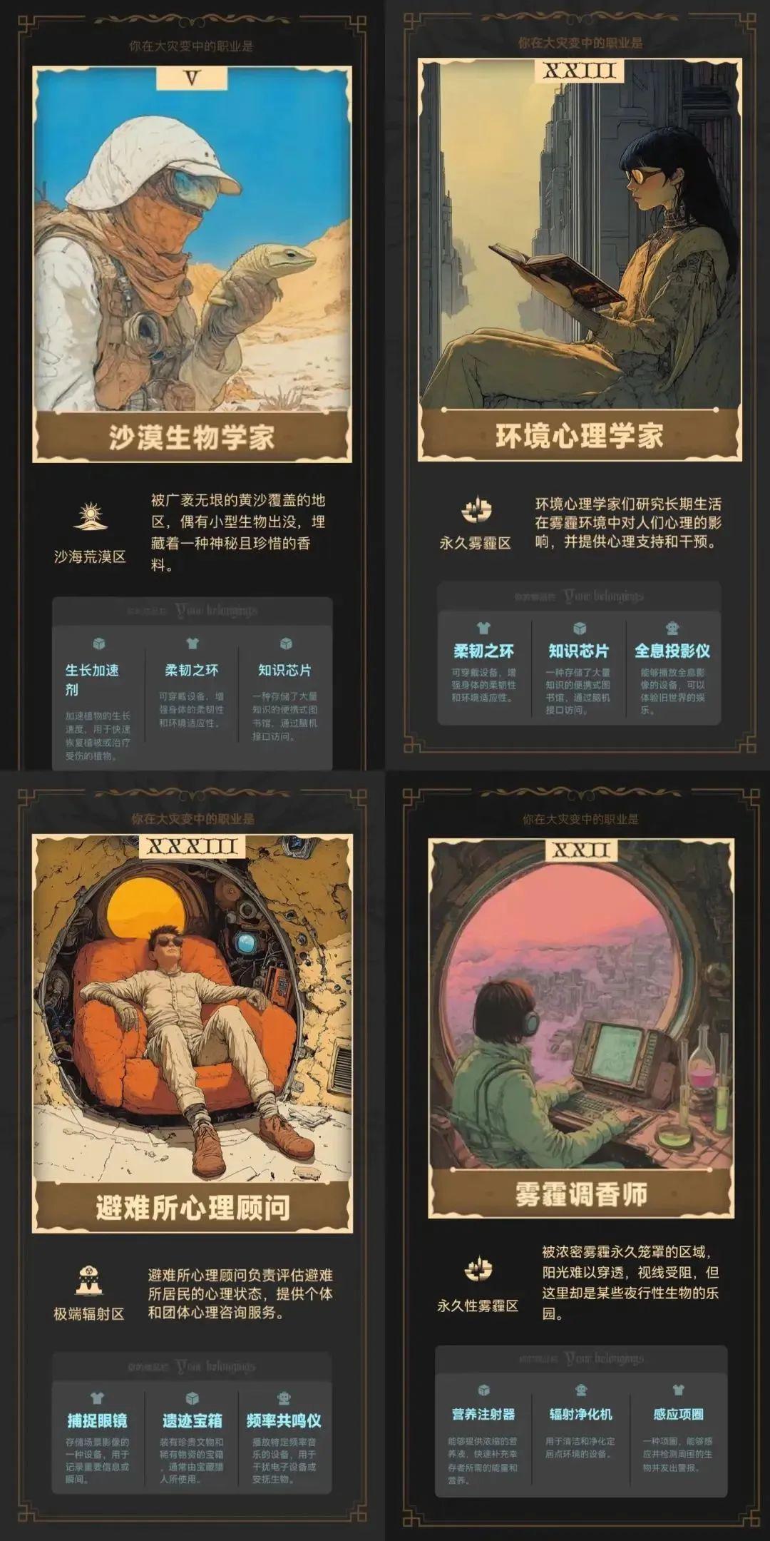 6个灾变地区、36个特殊职业。只需回答11个简单有趣的问题,就能够解锁灾变纪元中专属于你的职业卡牌。点击卡牌可翻转,背面有AIGC故事惊喜。(p.s.可以多次测试,祝你集齐全部卡牌!)