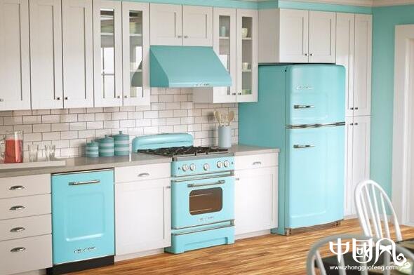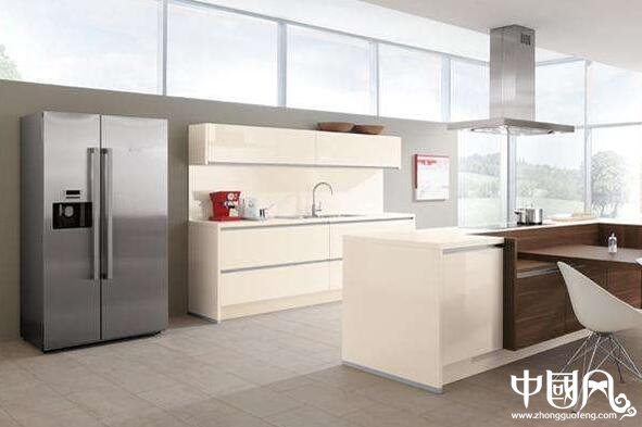 七、冰箱:一定要事先设计好冰箱的位置,以使“工作三角”设计合理。注意不要让冰箱紧挨着水槽,以免溅上水。