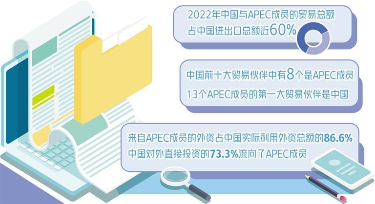习近平主席指出,中国的发展起步于亚太,得益于亚太,也将继续立足亚太、造福亚太。不断扩大高水平对外开放是推进中国式现代化的必然要求。中国成为大多数APEC成员主要贸易伙伴和出口市场。2022年中国与APEC成员的贸易总额占中国进出口总额近60%,中国前十大贸易伙伴中有8个是APEC成员,中国是13个APEC成员的第一大贸易伙伴,来自APEC成员的外资占中国实际利用外资总额的86.6%,中国对外直接投资的73.3%流向了APEC成员。