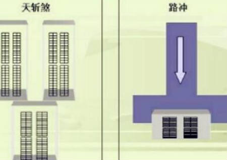 从宅内的门窗向外看去,如果前方有两座大厦靠得很近,中间只有一道相当狭窄的空隙,骤眼望去就仿佛大厦被从天而降的利斧所破,一分为二,这样的形状在风水学中称为天斩煞。