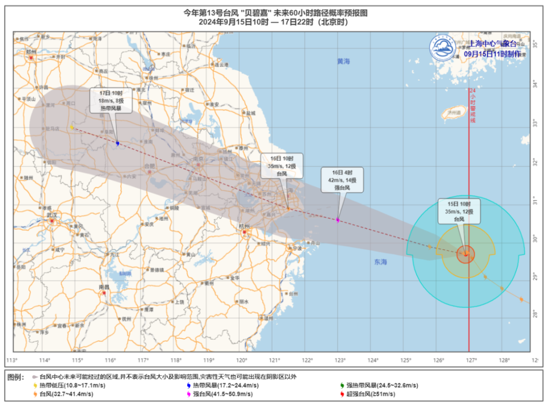 预计“贝碧嘉”将以每小时20—25公里的速度向西偏北方向移动,强度有所增强,最强可达强台风级(42米/秒,14级)。“贝碧嘉”将于16日凌晨到上午在上海浦东到浙江舟山一带登陆,登陆强度为台风或强台风(12—14级),登陆后强度逐渐减弱。
