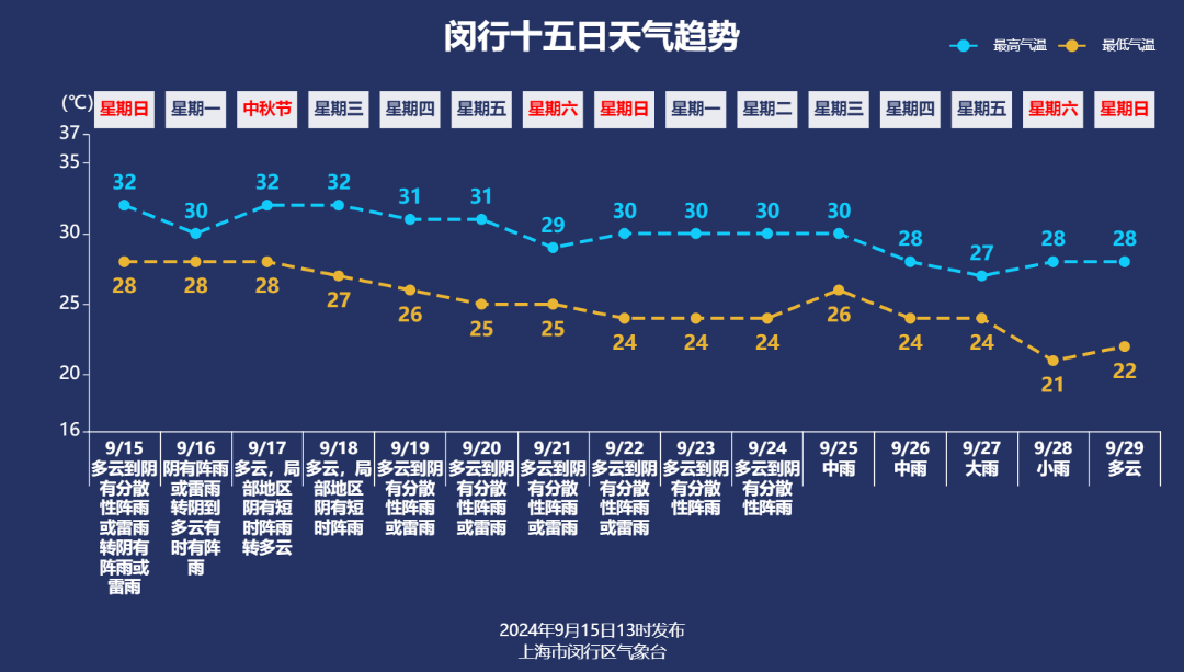 中秋节当天,台风影响基本结束,上海天气恢复平静,将是多云为主的天气,残留的云系偶尔带来一些短时阵雨或雷雨。节后上海主要处在副热带高压边缘,海上还有热带系统活动,总体以多云天气为主,有些短时阵雨,后期最低气温有所下调,早晚有点秋意了。