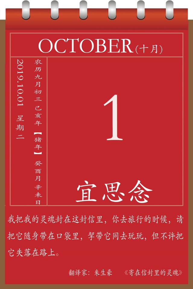 2019年10月1日,星期二,农历九月初三 (己亥年癸酉月辛未日),法定节假日。今天国庆节,祝祖国越来越强大,也祝您幸福安康,家庭美满快乐围绕!