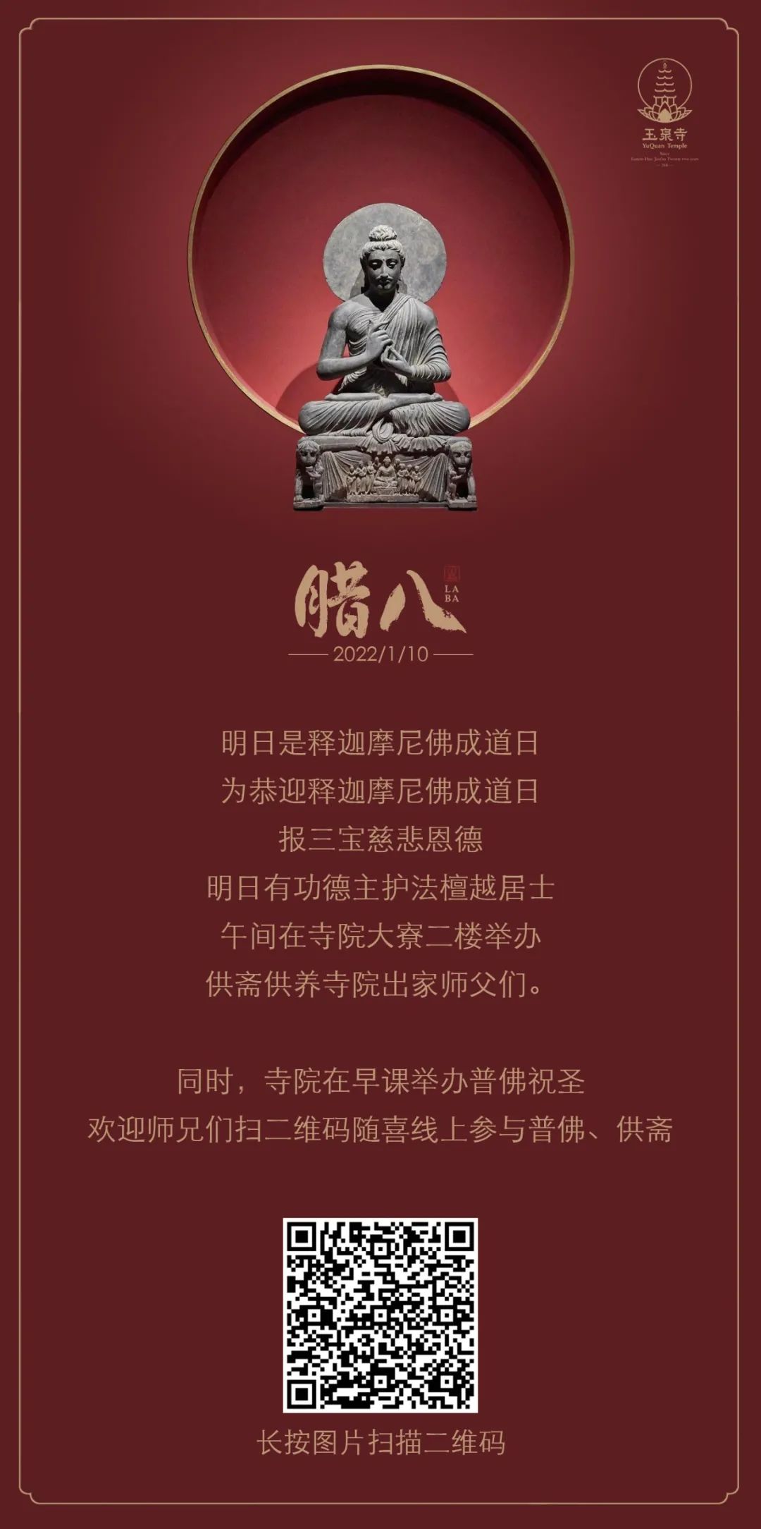 明日腊八是释迦摩尼佛成道日,为报三宝慈悲恩德,有功德主护法檀越居士,设斋供僧,普佛祝圣,扫二维码随喜线上参与普佛、供斋。