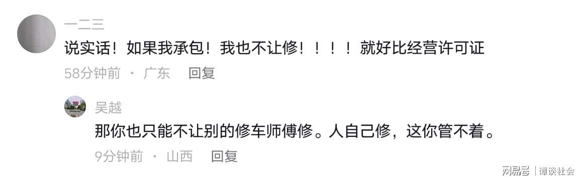 但这样的言论被网友反驳:你可以不让其他修车师傅修,但人家自己修自己的车,你管不着。