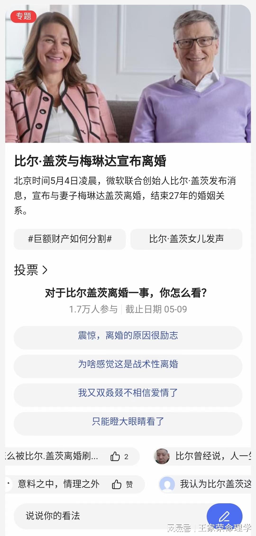 早上被小盖刷屏了,比尔盖茨离婚了,