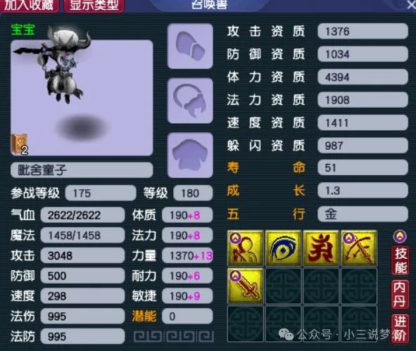 上面的这只召唤兽是梦幻西游中某些玩家比较喜欢的全力召唤兽,他的成长达到了1.3,还拥有着诸天正法的特殊技能,可以带高级吸血的套装,也可以带善恶有报的套装,上面这只召唤兽在没有带召唤兽装备的情况下,他的面板攻击就已经达到了3000。大家是不是都认为这种召唤兽比较好用,但是用过全力召唤兽的玩家会知道全力的召唤兽的生存能力是比较差的,刷任务的时候总是死,上面这只召唤兽的寿命都已经被用到51了。
