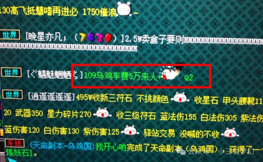 本周维护后部分服务器的玩家的天命副本任务的获得奖励的方式发生了改变,不但是天命抽奖,而是直接给了一个宝袋,由各位玩家自己开学有可能会获得一些物品奖励。虽然这样的调整对于队长的奖励并没有任何的影响,但是梦幻西游中某些玩家还是认为队长的奖励被削弱了,再之后就有一部分玩家刷副本任务的时候表示要收费刷副本,上面这位玩家在乌鸡国都要收5万的梦幻币。